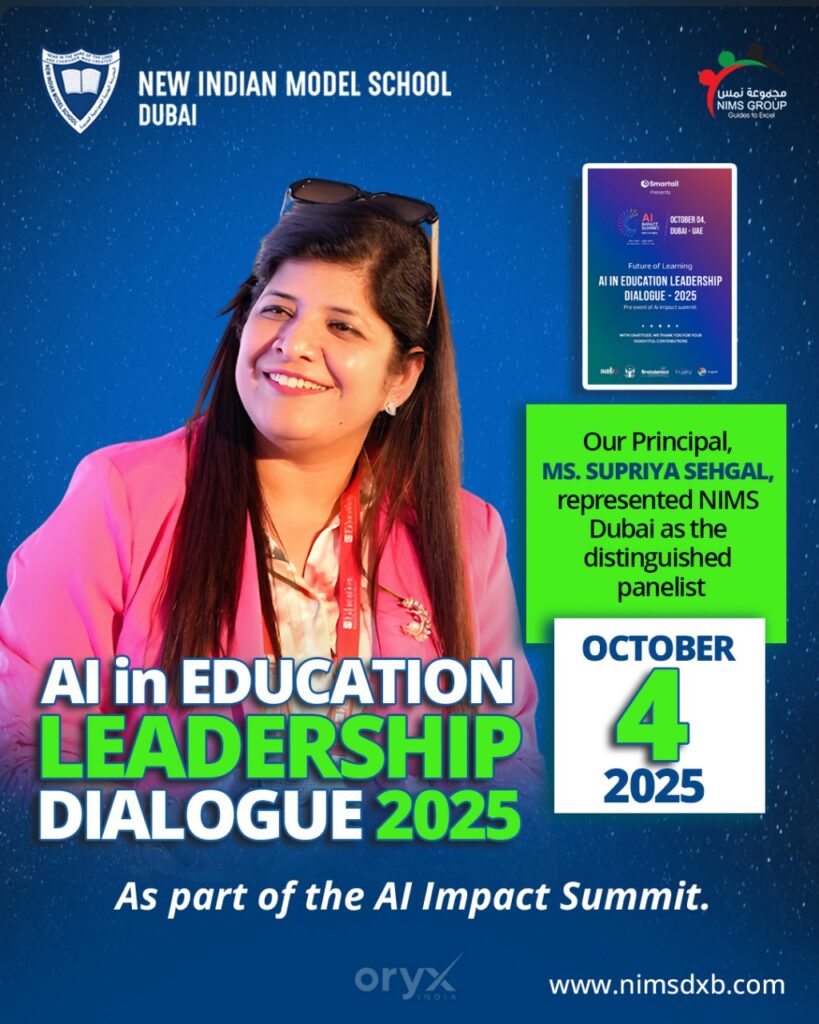 Our Principal, Ms. Supriya Sehgal, represented NIMS Dubai as a distinguished panelist at the AI in Education Leadership Dialogue 2025, held on October 4, in Dubai, as part of the AI Impact Summit.
